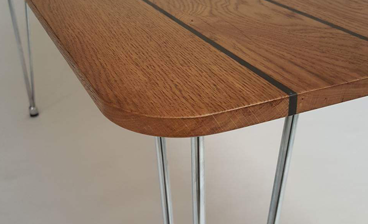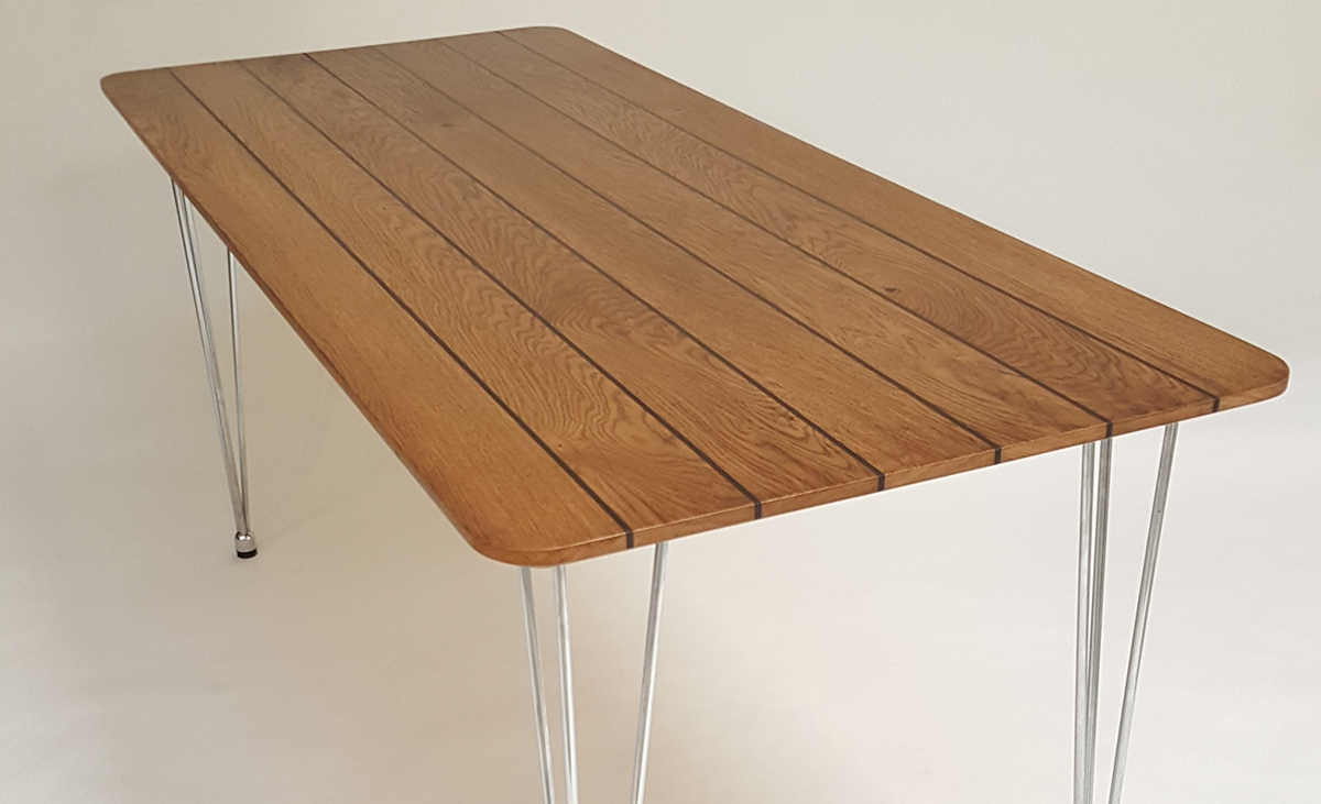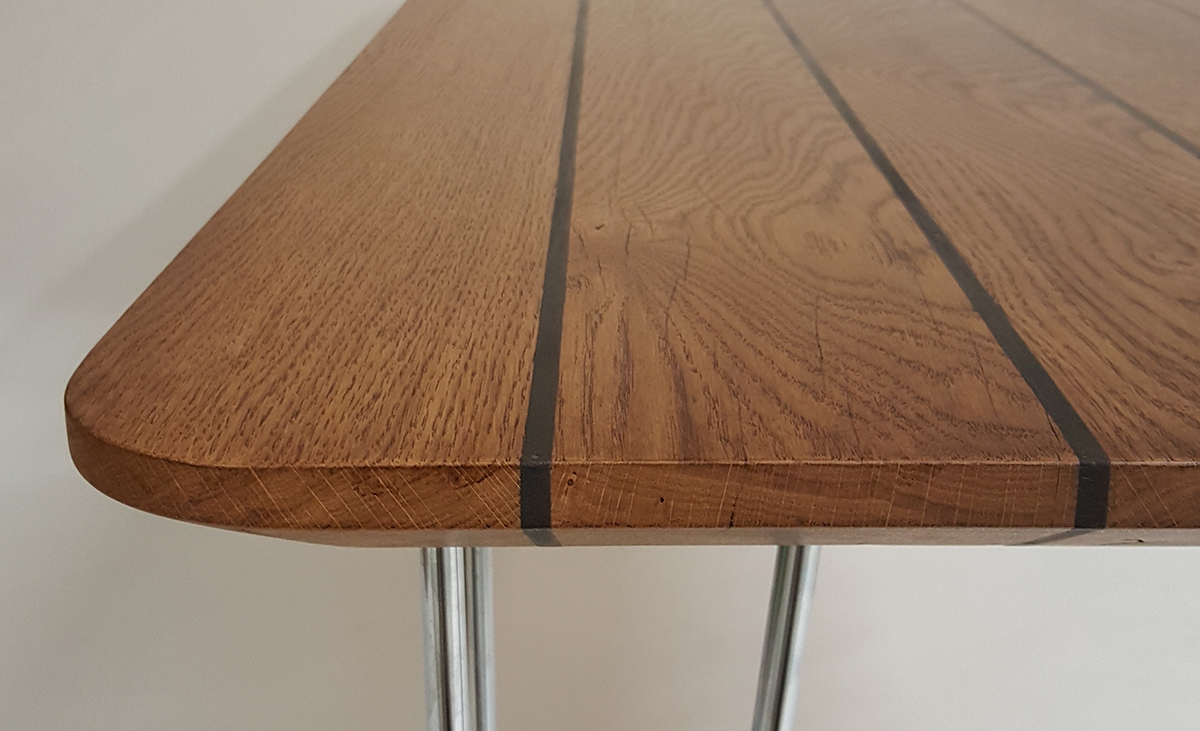 massives Eichenholz, verchromte Tischbeine, dauerelastische Füllmasse, Wachs